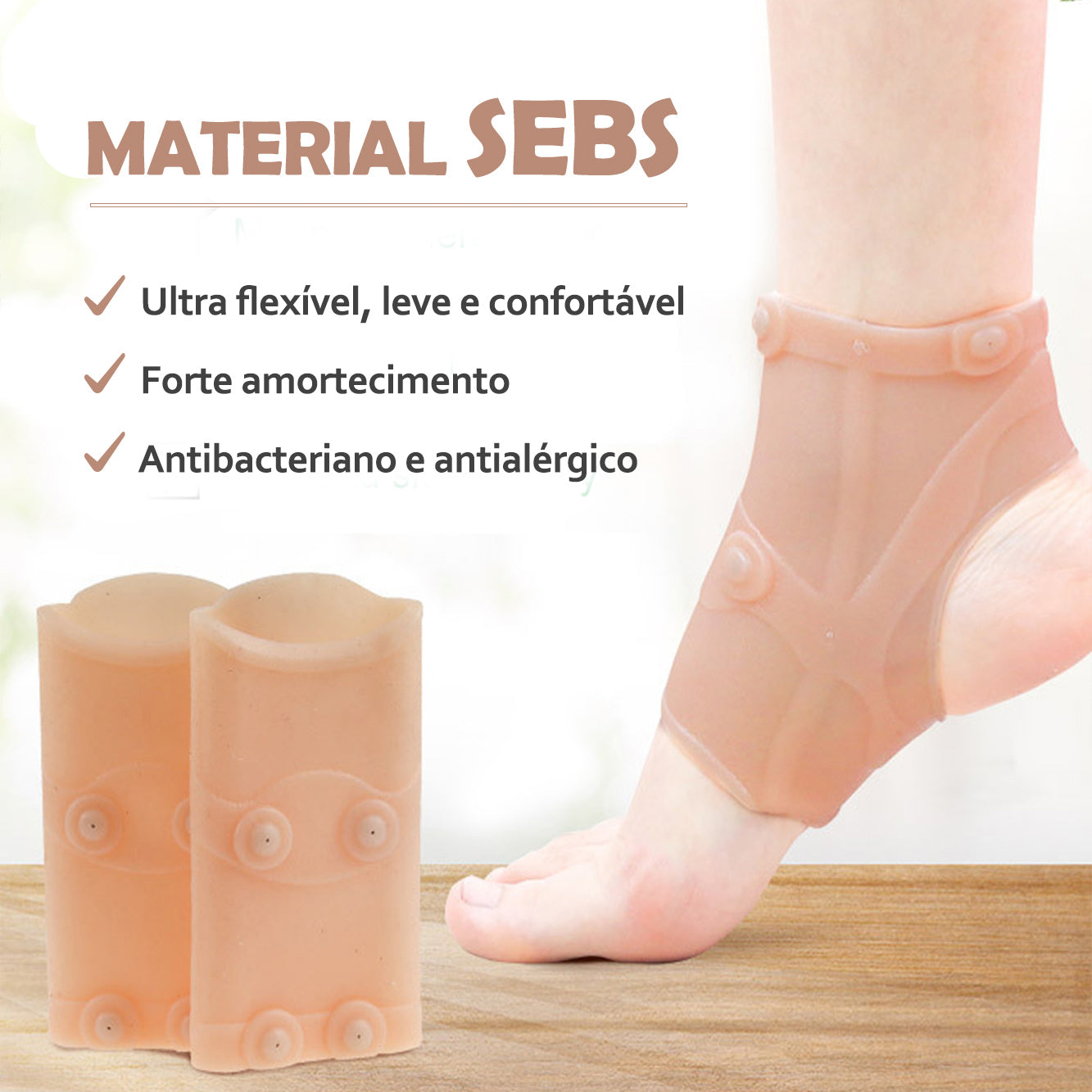 Diferente das tornozeleiras tradicionais em tecido, ela é feita de um material chamado SEBS, uma borracha do tipo elastômero flexível, que lhe confere um toque suave, extremamente elástico, leve, flexível, resistente a umidade, com forte amortecimento, antibacteriano e antialérgico.